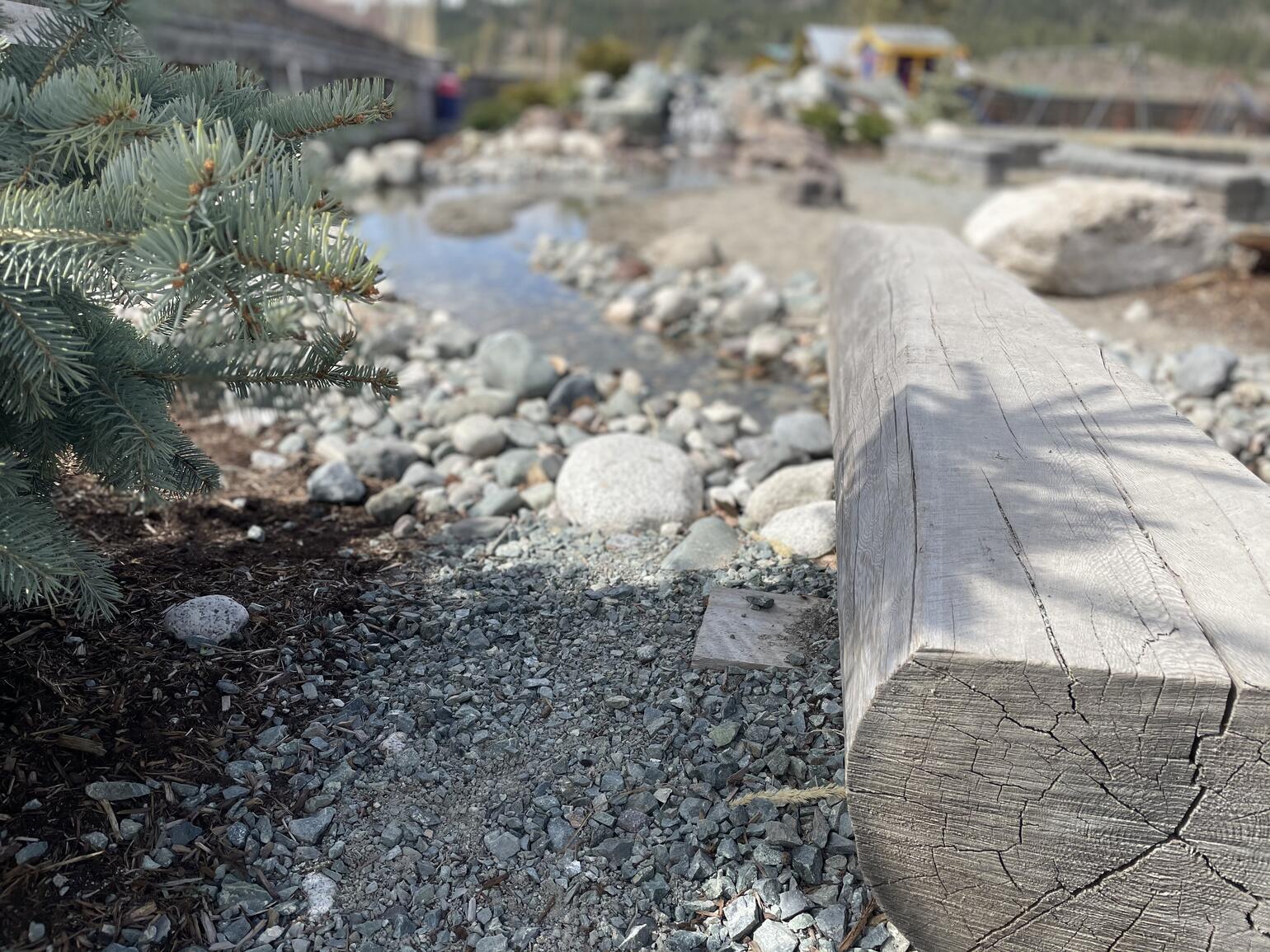 This is so that students can walk the perimeter of the stream and the calming space. While walking, they are to identify the life that they are caring for and how that life will care for them (ie, the medicines that we care for will one day support us, the insects and animals that we care for will one day supply us, etc). Stop at each of the cardinal points, indicated by the Grandfather Rocks from the 4 different Nłeʔkèpmx bands, and find something to be thankful for.
